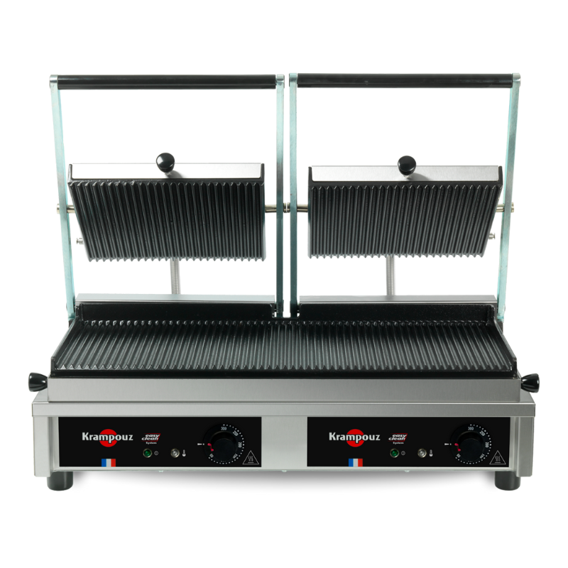This Contact Grill is a simple model with smooth and grooved plates of 220 x 230 mm. It comes with a grease collector tray and splash-proof edges. Independently adjustable thermostats continuously up to 300 °C, with indicator lights.