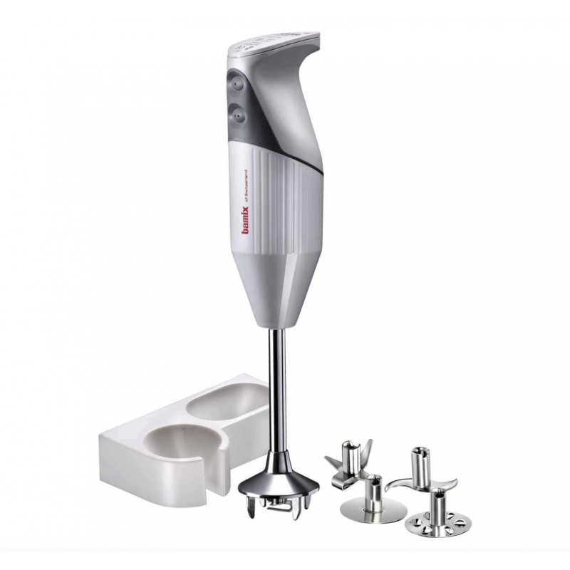 The Dynashake pack includes a Dynashake (Dynamix with waterproof skirt) equipped with a standard 2-blade knife + 4-blade emulsifier knife + beater disc + emulsifier disc + 1-liter graduated bowl with lid.
