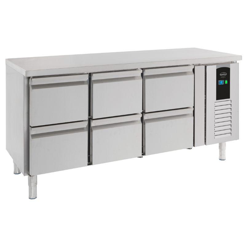 The Positive Refrigerated Table with Backsplash - 6 Drawers Dynasteel is therefore a choice solution for professionals seeking performance, durability, and compliance with the strictest hygiene standards.